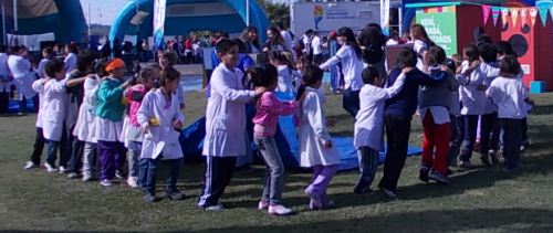 | Chicos y chicas de la escuela primaria, con guardapolvo blanco, jugando al aire libre. |